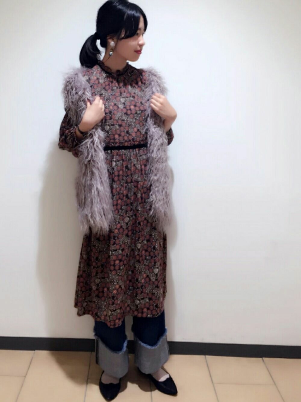 ガウンにもなるオリエンタルな ワンピースにふわふわの エコファーベストを合わせて グッと秋らしく♪ 折り返しデニムパンツでカジュアルに 外すのが本気すぎないで◎ 🎫model:るこ。🎫 ジャンルを問わないオシャレコーデるこ。のwearもゼヒcheckしてみてください♩