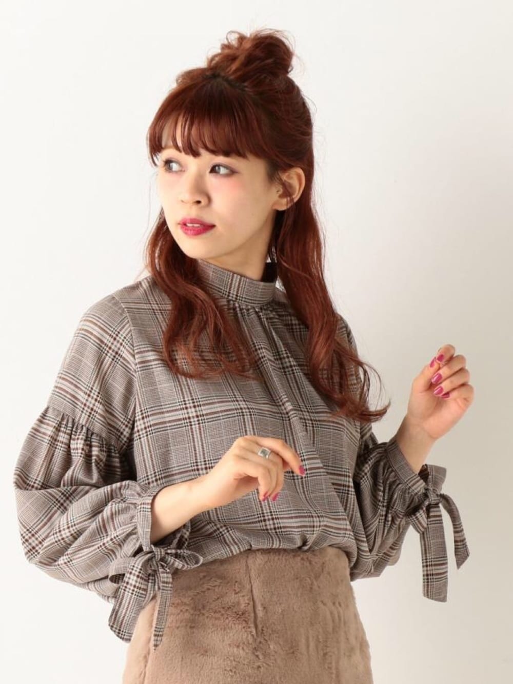 袖コンシャスなブラウスを主役に✨ チェックでちょっとクラシカルな印象。 ふわふわのフェイクファーのスカートを合わせて女の子らしく🐻💕 🍒model:あかねこ🍒 フェミニンコーデなあかねこのSNSもゼヒcheckしてみてください❤︎