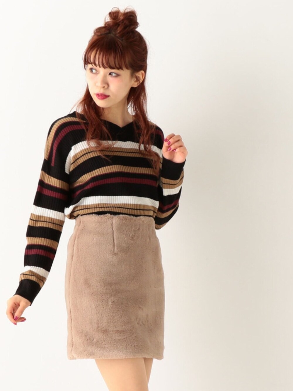 秋カラーのマルチボーダーニットで 落ち着いた大人の雰囲気に✨ ボトムスはファーのタイトスカートで フェミニンさもプラスして。。。 🍒model:あかねこ🍒 フェミニンコーデなあかねこのSNSもゼヒcheckしてみてください❤︎