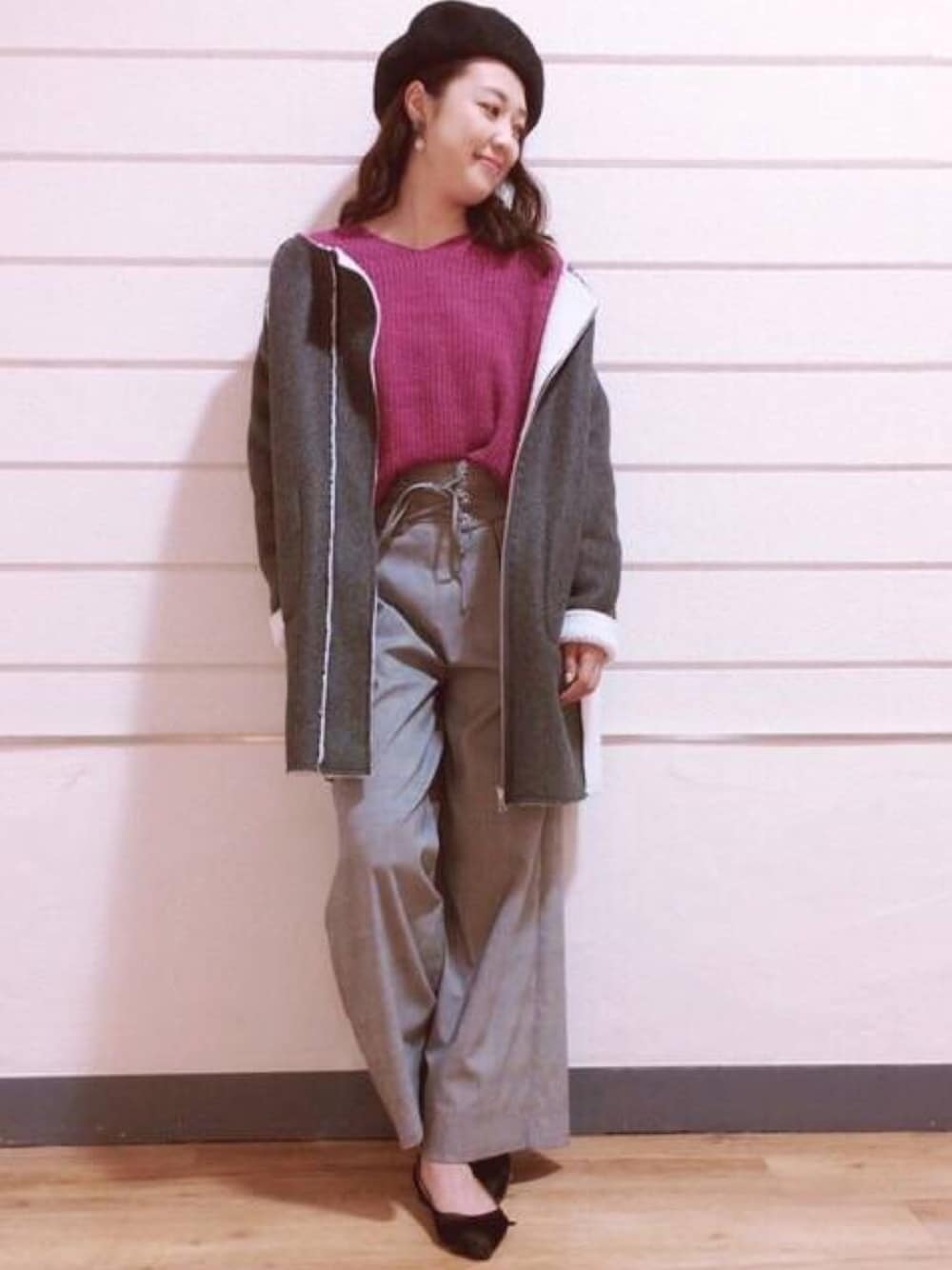 ミドル丈のアウターは リバーシブルでも使える優秀アイテム✨✨ ラグランなので少し肩を落とすのが◎ グレー×ピンクで大人フェミニンに💕