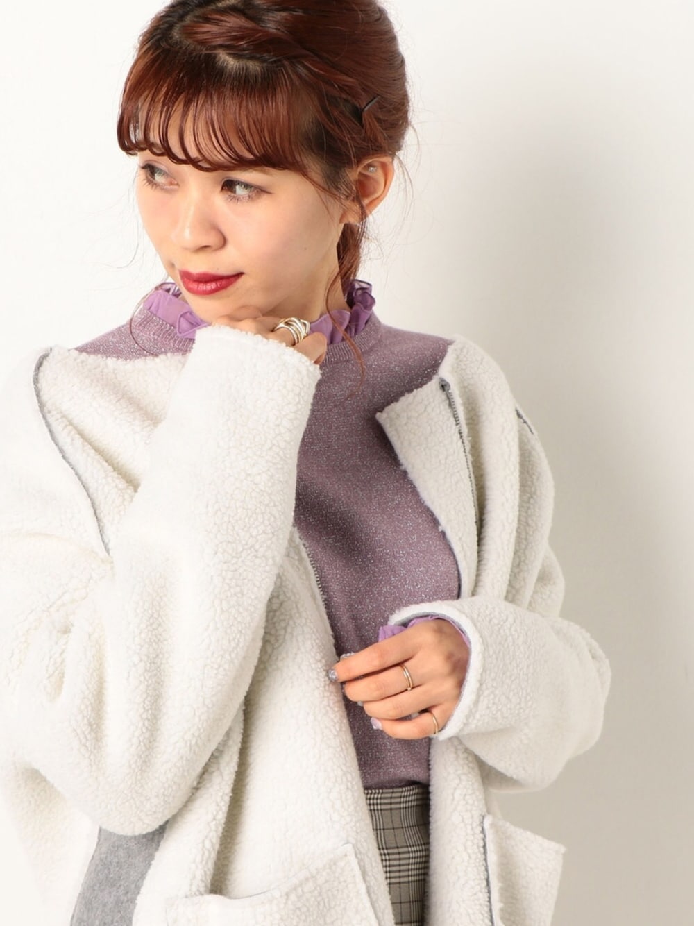 今年人気のボアのアウターは リバーシブルで1枚2役で着れちゃう優秀アウター✨ ラメが可愛いニットをインナーに合わせて カジュアルフェミニンなコーディネート💕 🍒model:あかねこ🍒 フェミニンコーデなあかねこのSNSもゼヒcheckしてみてください❤︎