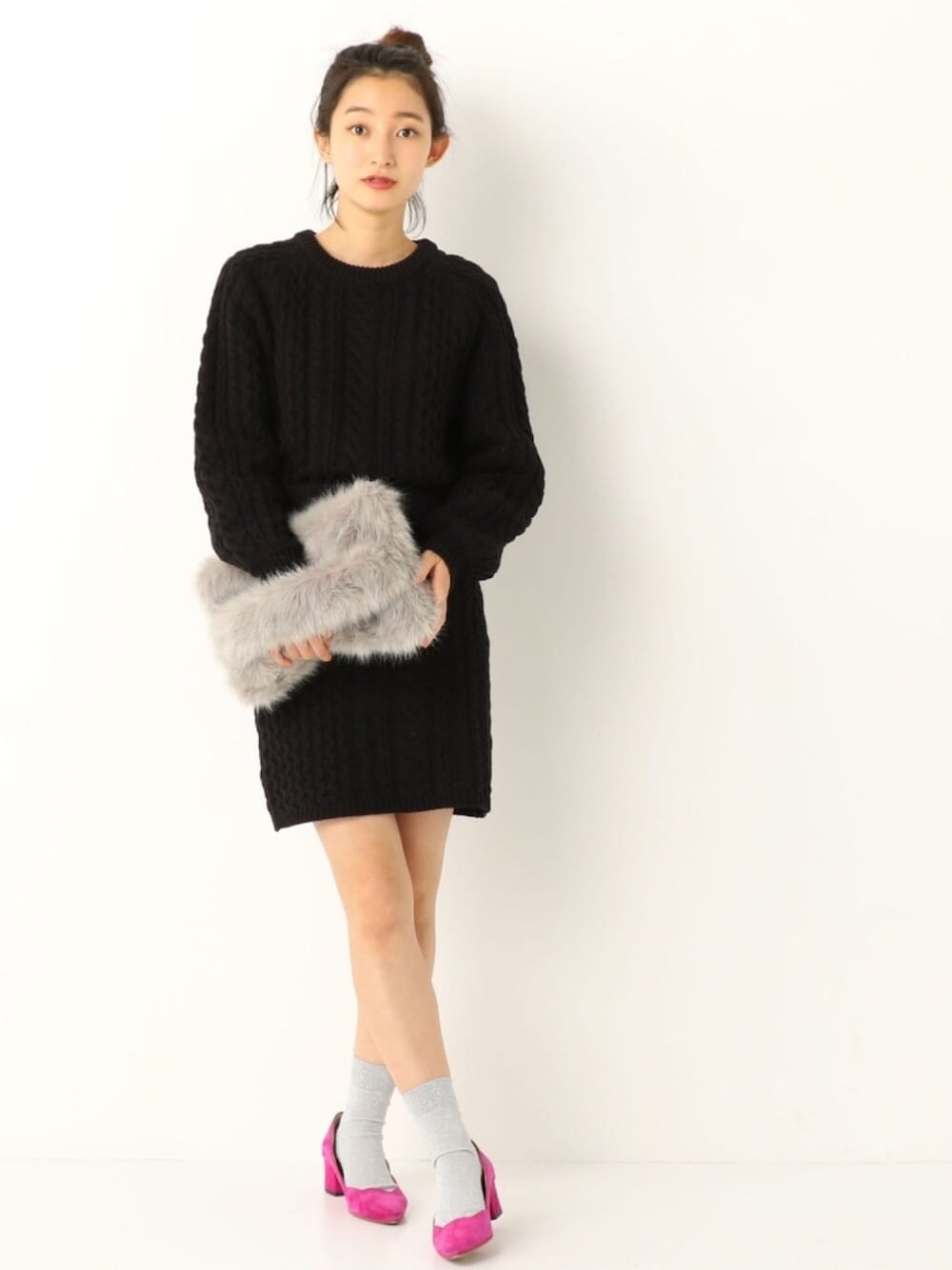 旬なニットアップはブラックをチョイス✨ タイトスカートだからヘルシーに大人っぽく💄 ファークラッチとピンクのパンプスでパーティ感もアップ🎄🔔✨