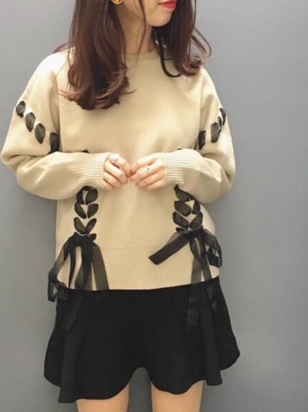 レースアップがかわいいニットに 裾がフレアのスカートで 大人ガーリーにコーデ♡ 🐰model:ayaka🐰 トレンドフェミニンなayakaのWEARもゼヒcheckしてみてください♪