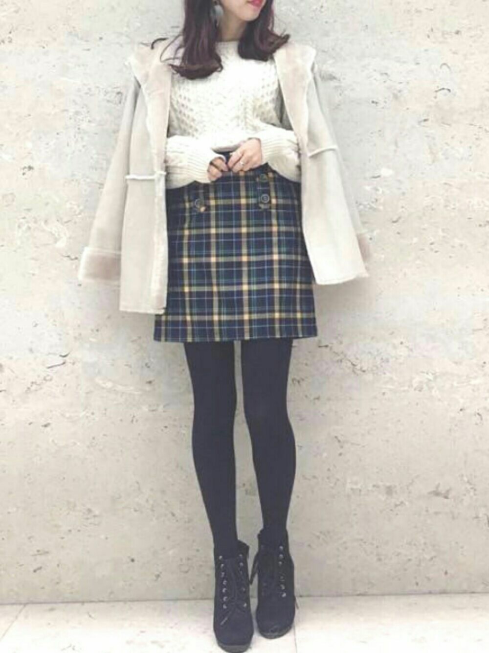 チェックスカートをメインに トレンドのケーブルニットを合わせて 大人カジュアルに😌 肌触りのよいムートンコートで リラックス感あるスタイルに♪ 🐰model:ayaka🐰 トレンドフェミニンなayakaのWEARもゼヒcheckしてみてください♪