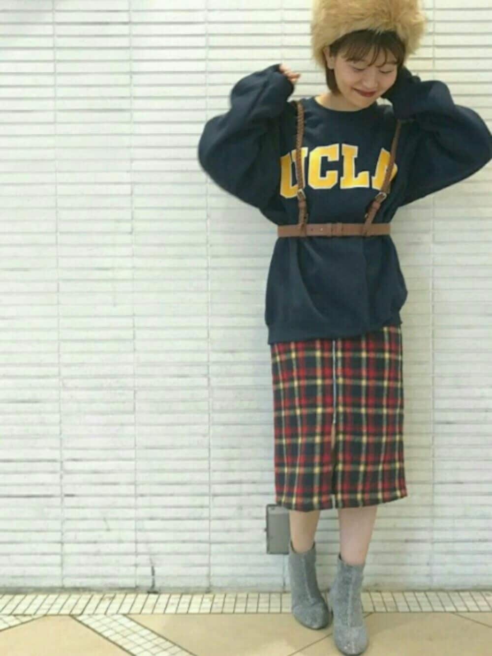 オーバーサイズスウェットは タイトスカートで スッキリコーディネート✨ ファー小物とハーネスで個性的に♪