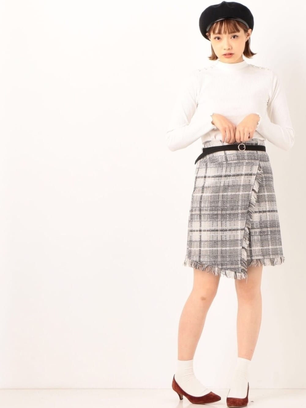 ツイードの巻きスカートをメインに トップスはシンプルに✨ 全体をモノトーンでまとめて 足元に色でポイントを