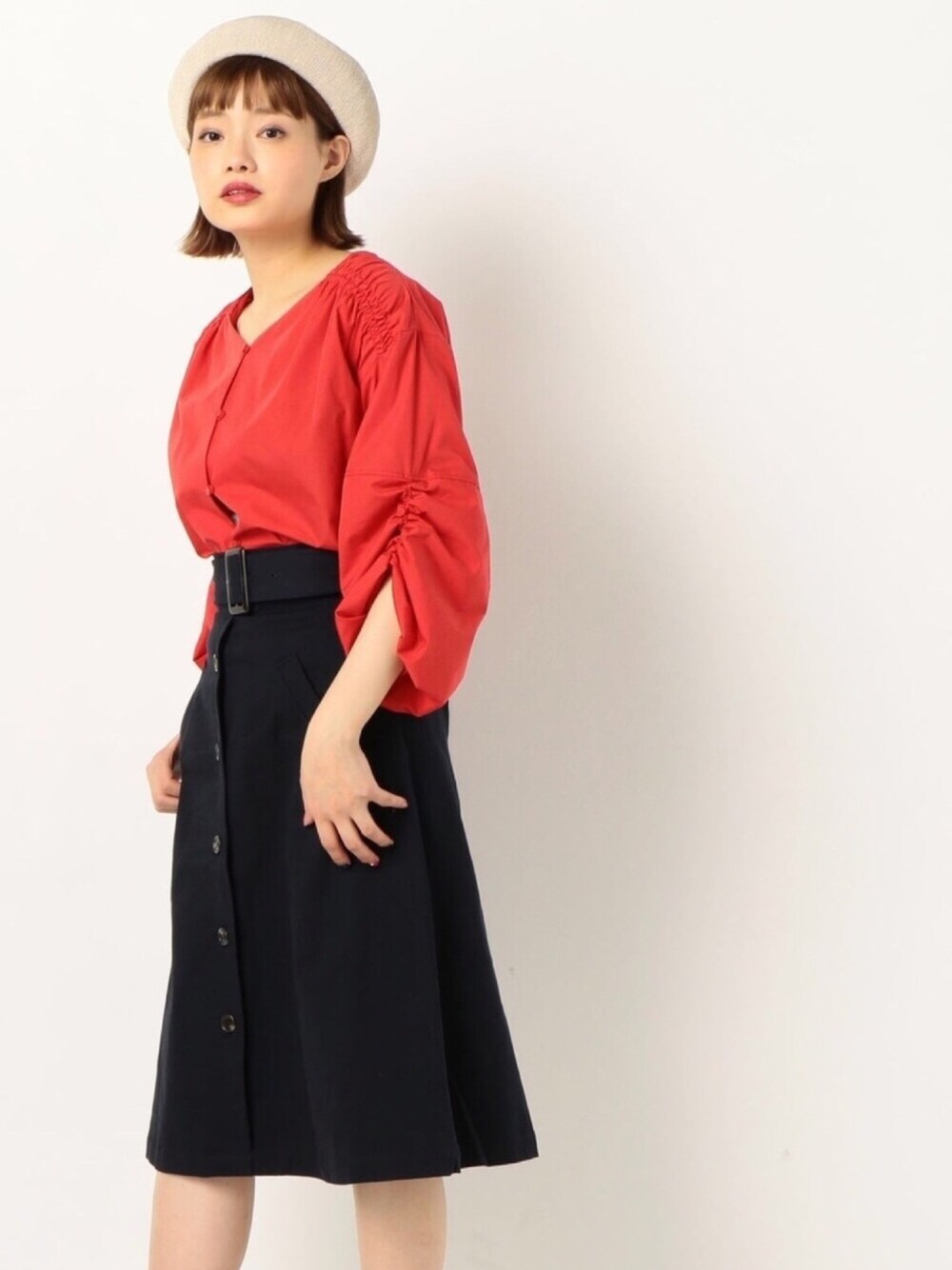 袖にボリュームのあるブラウスは チノスカートでスッキリまとめて✨ 少しかっちりめな大人可愛いコーデ