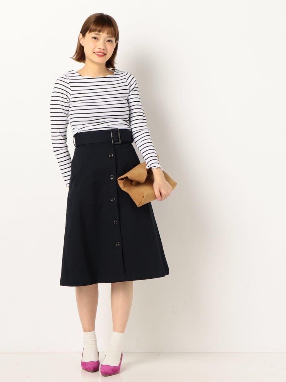 チノスカートとボーダートップスで カジュアルに✨ 足元にピンクを持ってきて 春らしく🌸