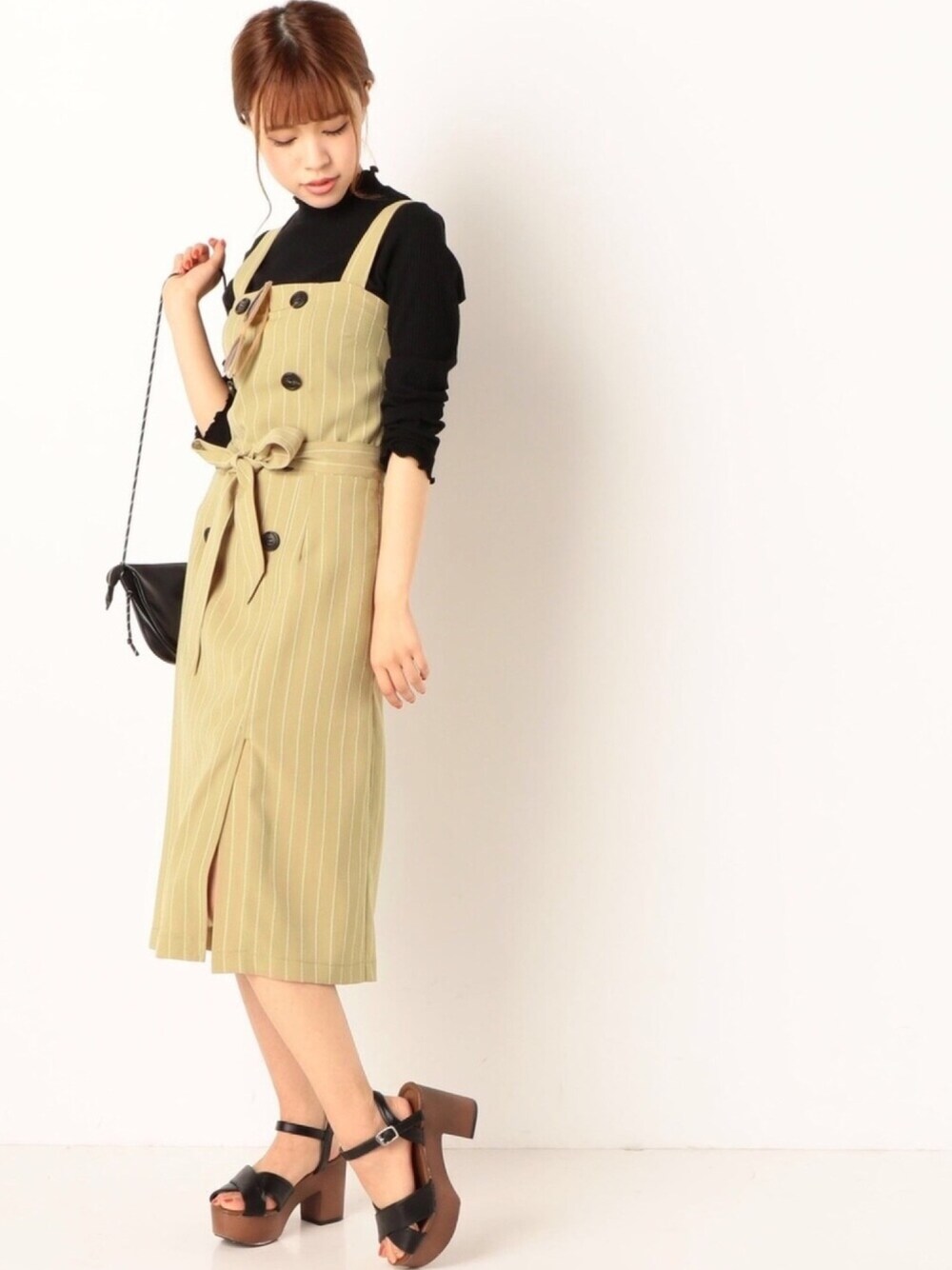 ラインがスッキリきれいな ストライプのジャンパースカート✨✨ インナーと小物は黒でメリハリをつけて サコッシュでカジュアル感をプラス