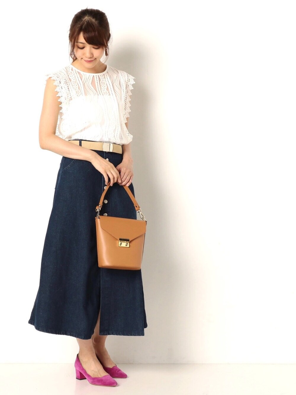 大人気のシンプルなレーストップス✨✨ ガチャベルト付きのデニムスカートで カジュアルダウン 小物使いで大人っぽく