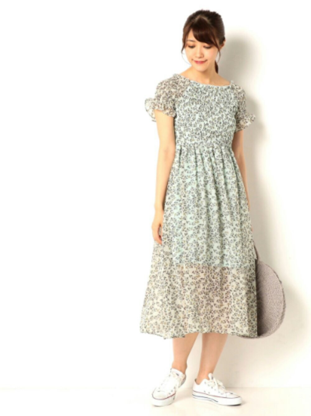 ミントグリーンが爽やかな花柄ワンピースは オフショルでも着れて夏にぴったりな一枚🌻 足元はスニーカーでカジュアルに✨