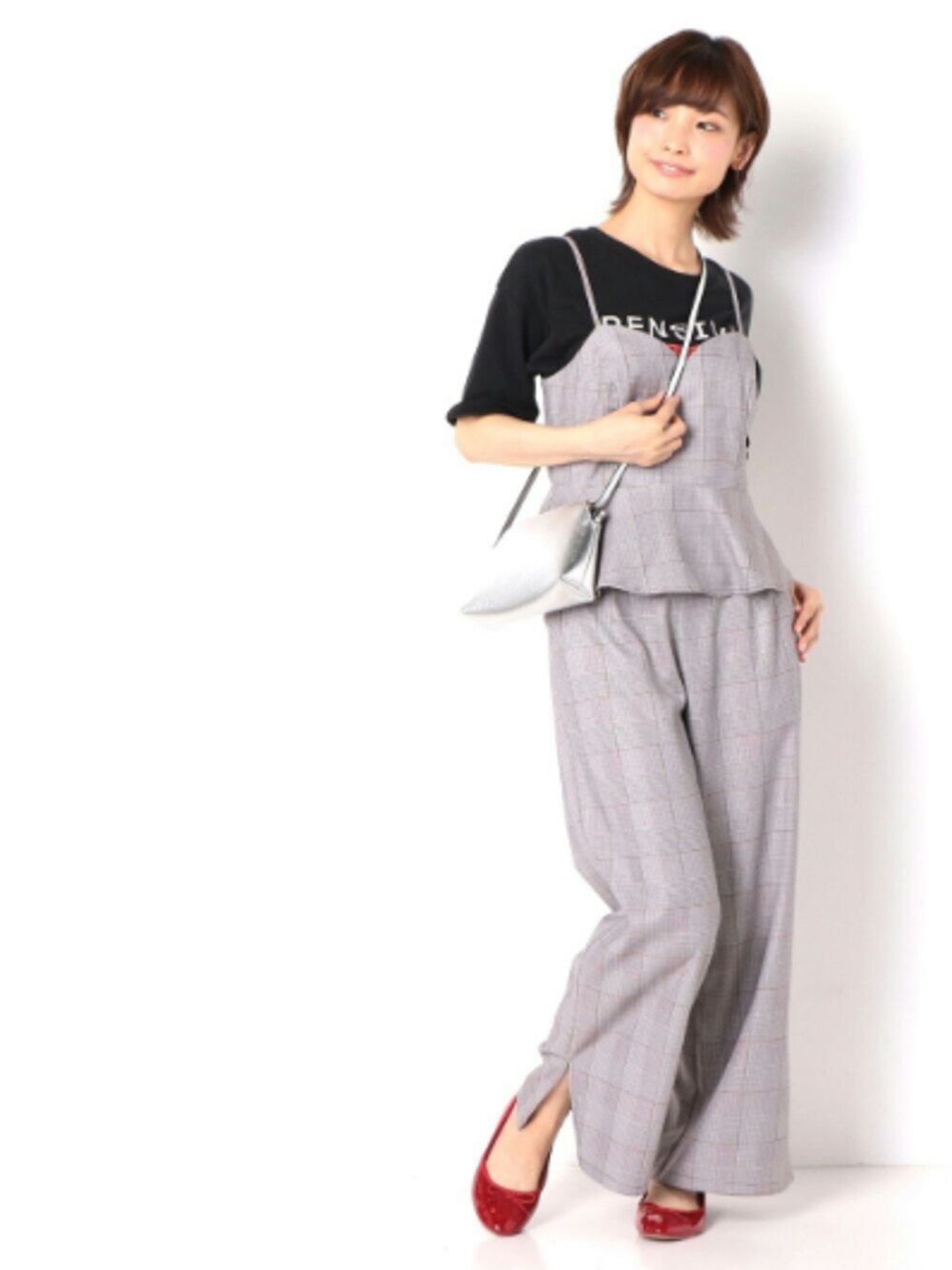 チェックのセットアップは ロゴTで合わせて大人カジュアルに✨ 赤のバレエシューズをワンポイントに◎