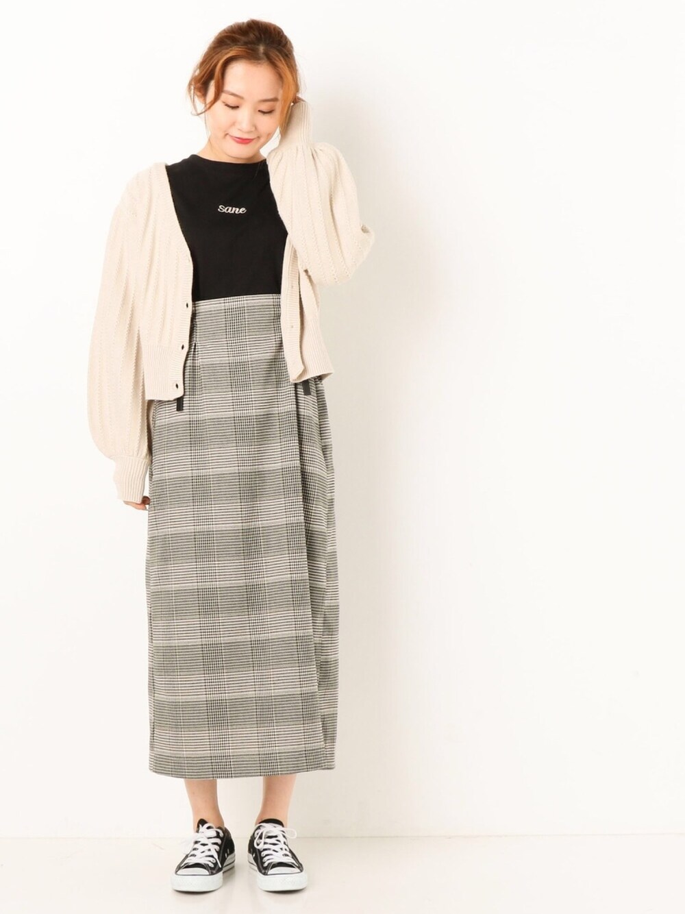 ボリューム袖がポイントの ニットカーデに スカートを合わせてた シンプルコーデ💕 カーディガンはプルオーバー でも着れます◎