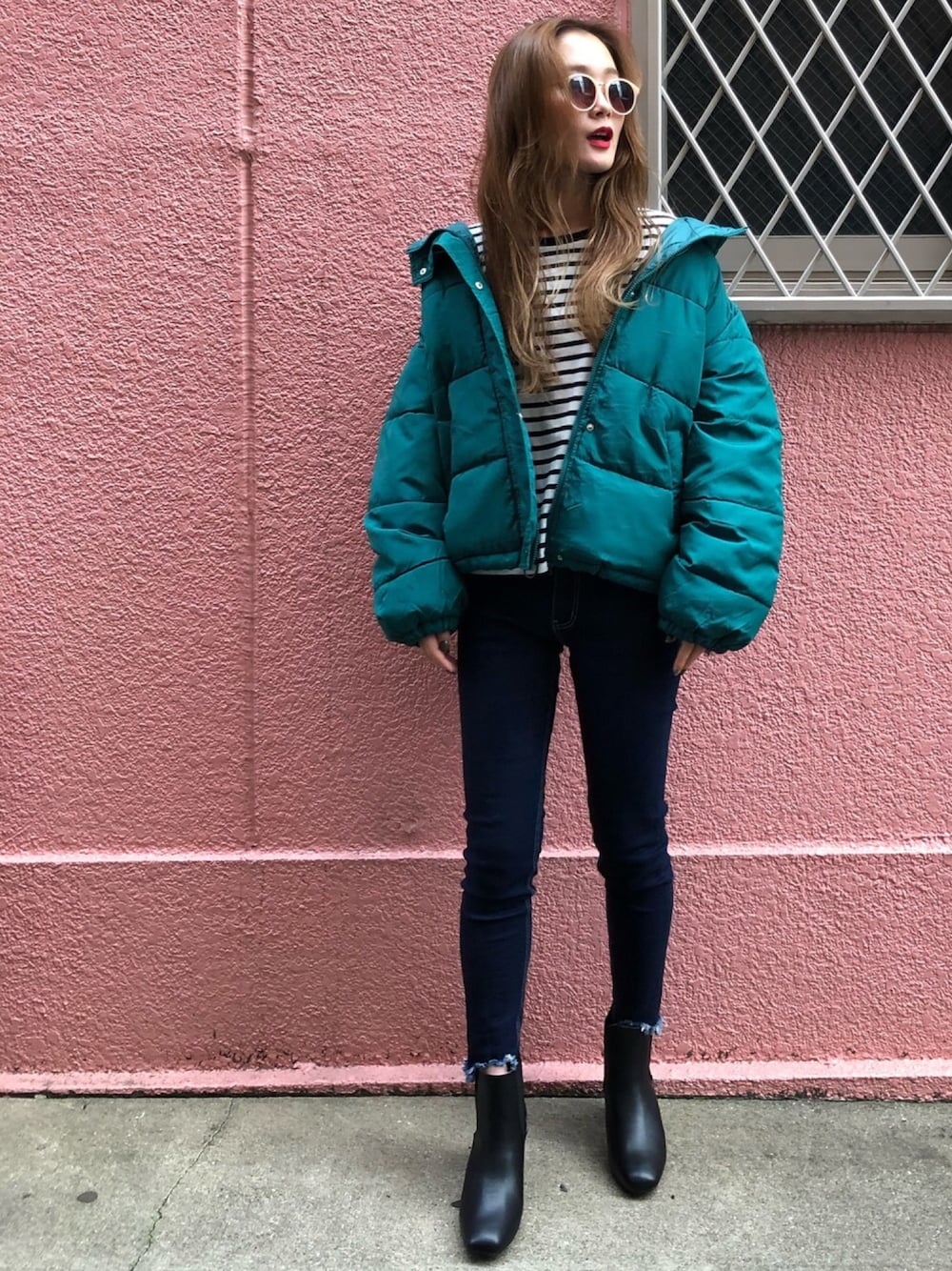 カラーダウンはスキニーデニムを合わせて シンプルに✨