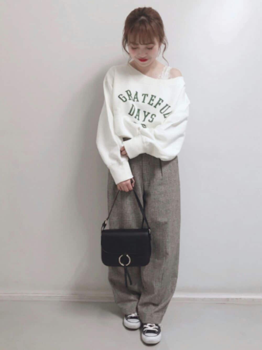 オフショルのスウェットと チェックパンツのゆるコーデ✨