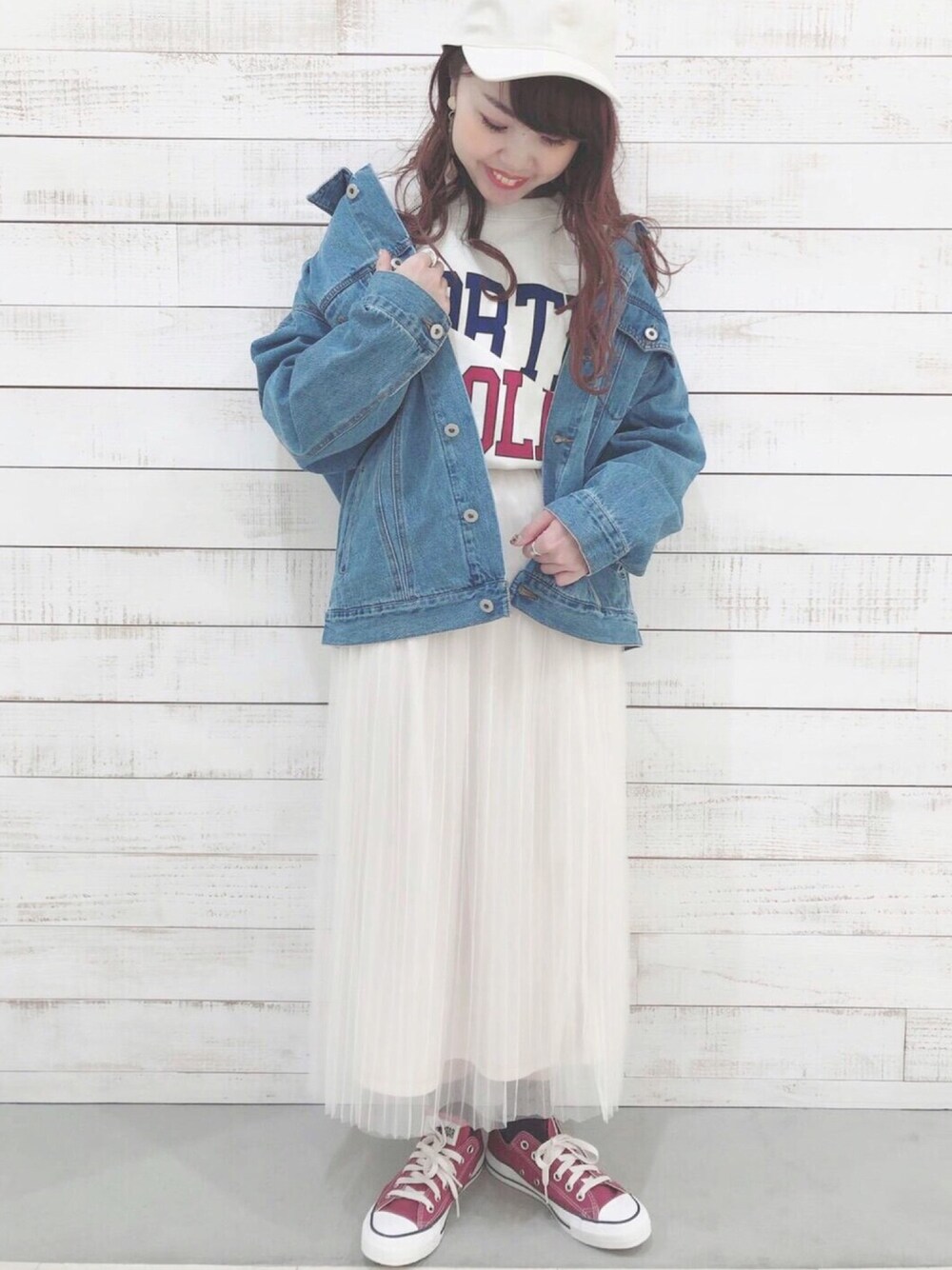 デニムジャケットにロゴトップスのカジュアルコーデもプリーツスカートでハズすのがおススメ✨ オールホワイトにデニムを合わせた春先取りコーデ🌸