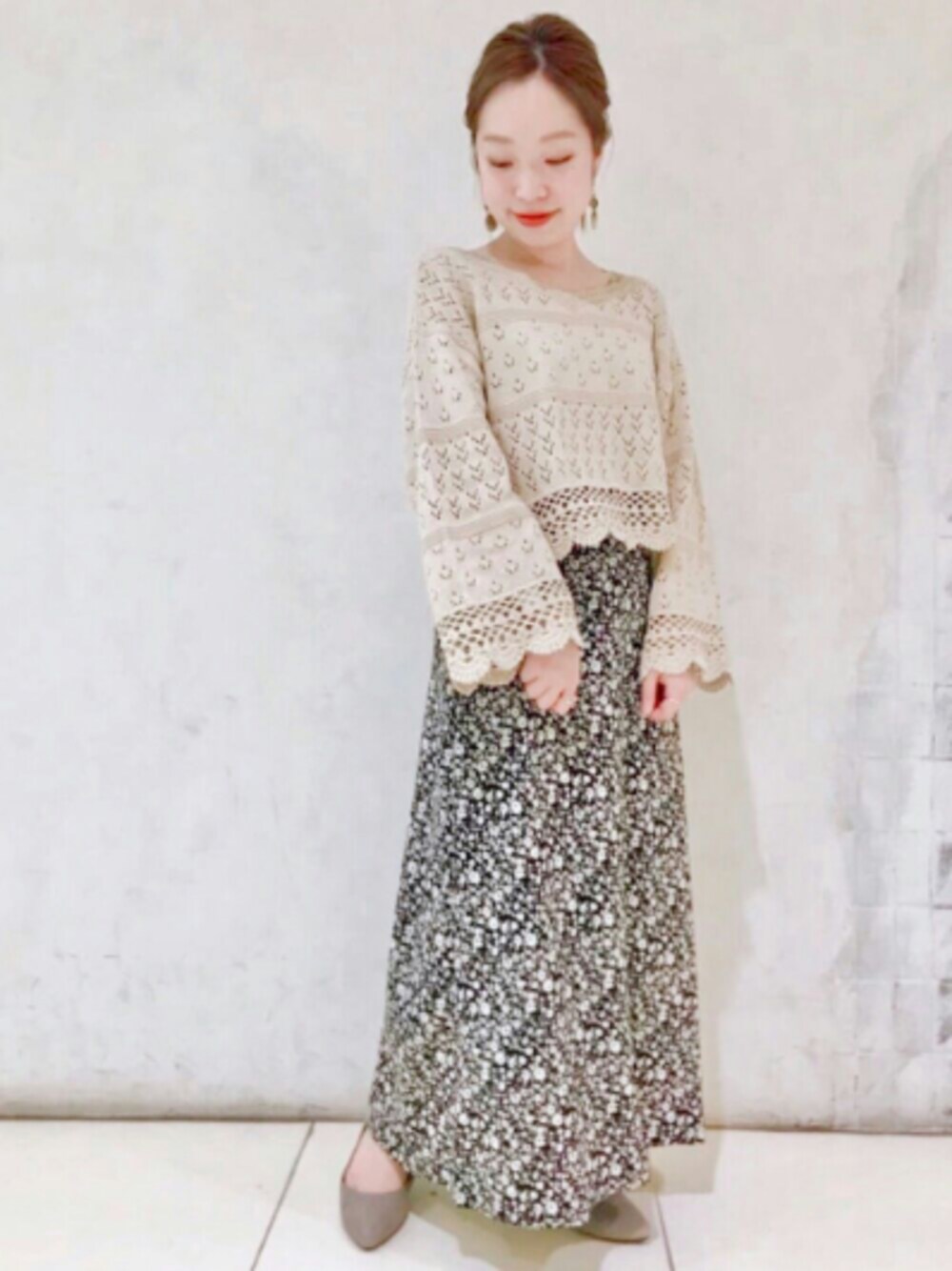 かぎ針ニットは袖と裾の デザインがワンポイントに◎ 単色花柄のスカートと合わせて 春のモノトーンコーデ✨