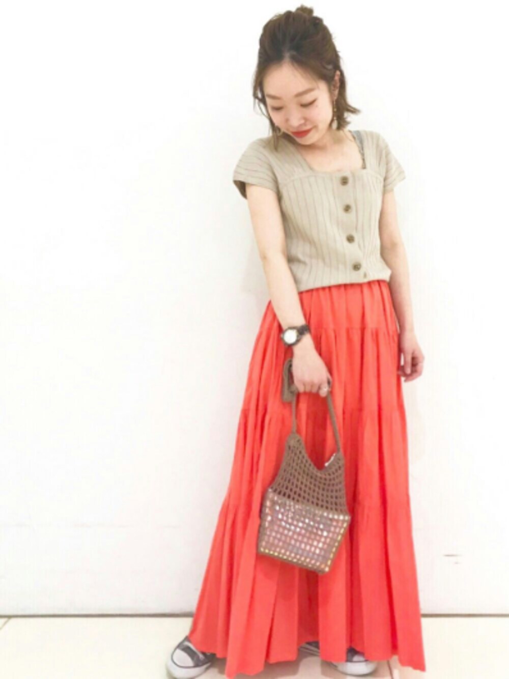 オレンジのティアードスカートで夏を先取り🌻 スクエアネックのニットはデコルテがスッキリ見えて◎