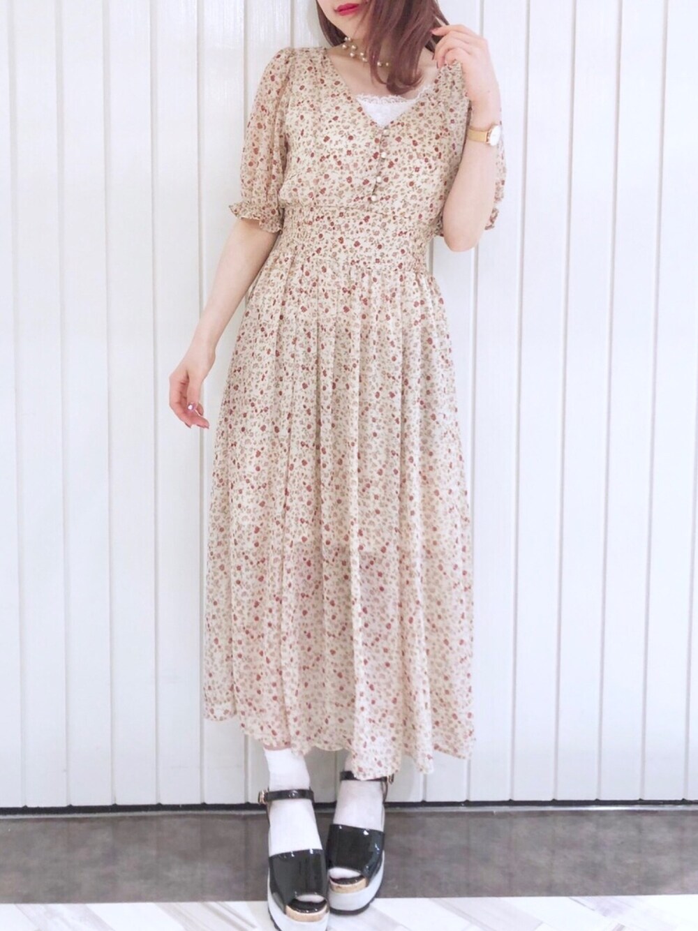 archivesのワンピース「五分袖花柄シャーリングワンピース」を使ったコーディネート