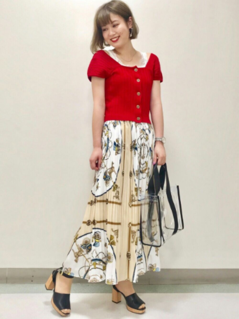 パネル柄のプリーツスカートと パキッとした赤のニットの夏コーデ✨