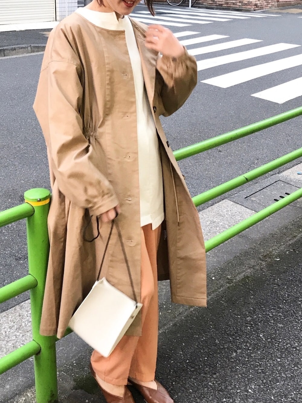 ガスコートにカラーパンツでアクセント✨