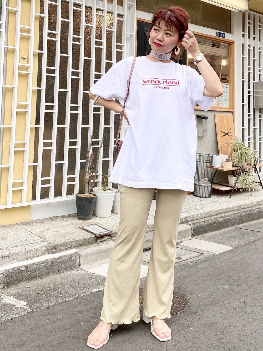 赤のロゴがポイントのTシャツにリブパンツのカジュアルスタイル♩ 小物使いでわたしらしさをプラス☺︎