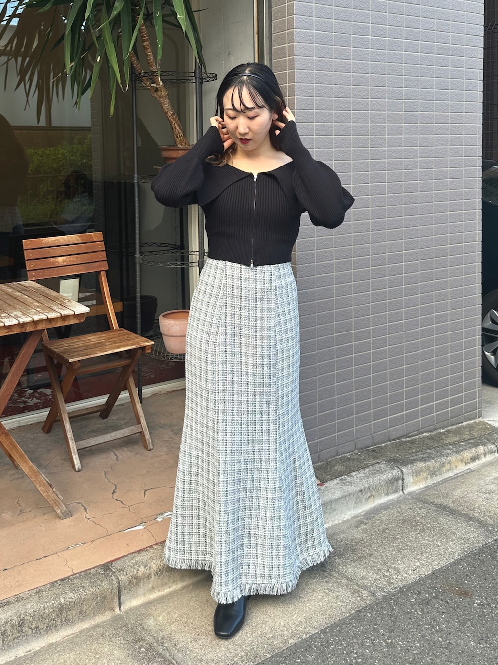 archivesのニット/セーター「フロントzipオフショルリブニット」を使ったコーディネート