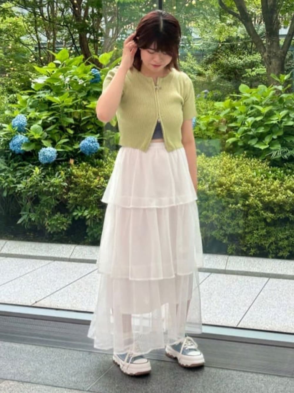 梅雨カラーコーデ☔️ ニットは緑でラメが散らばったデザインです!ダブルZIPになっているので、抜け感も楽しめるアイテムです!