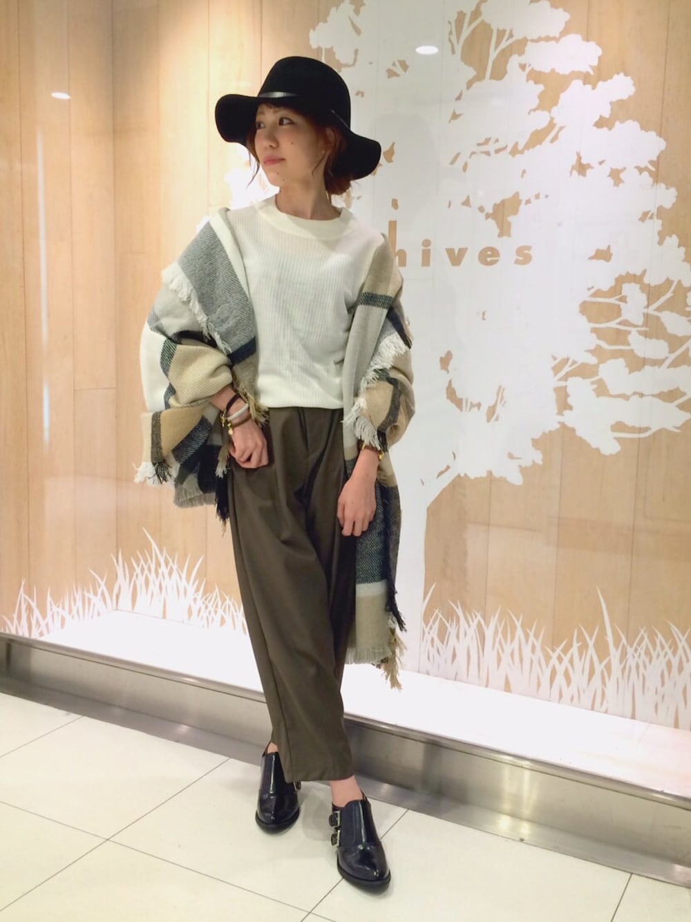 シンプルな組み合わせに、チェックストールでポイントを。 テーパードパンツはスッキリシルエットで足を綺麗に見せてくれます。