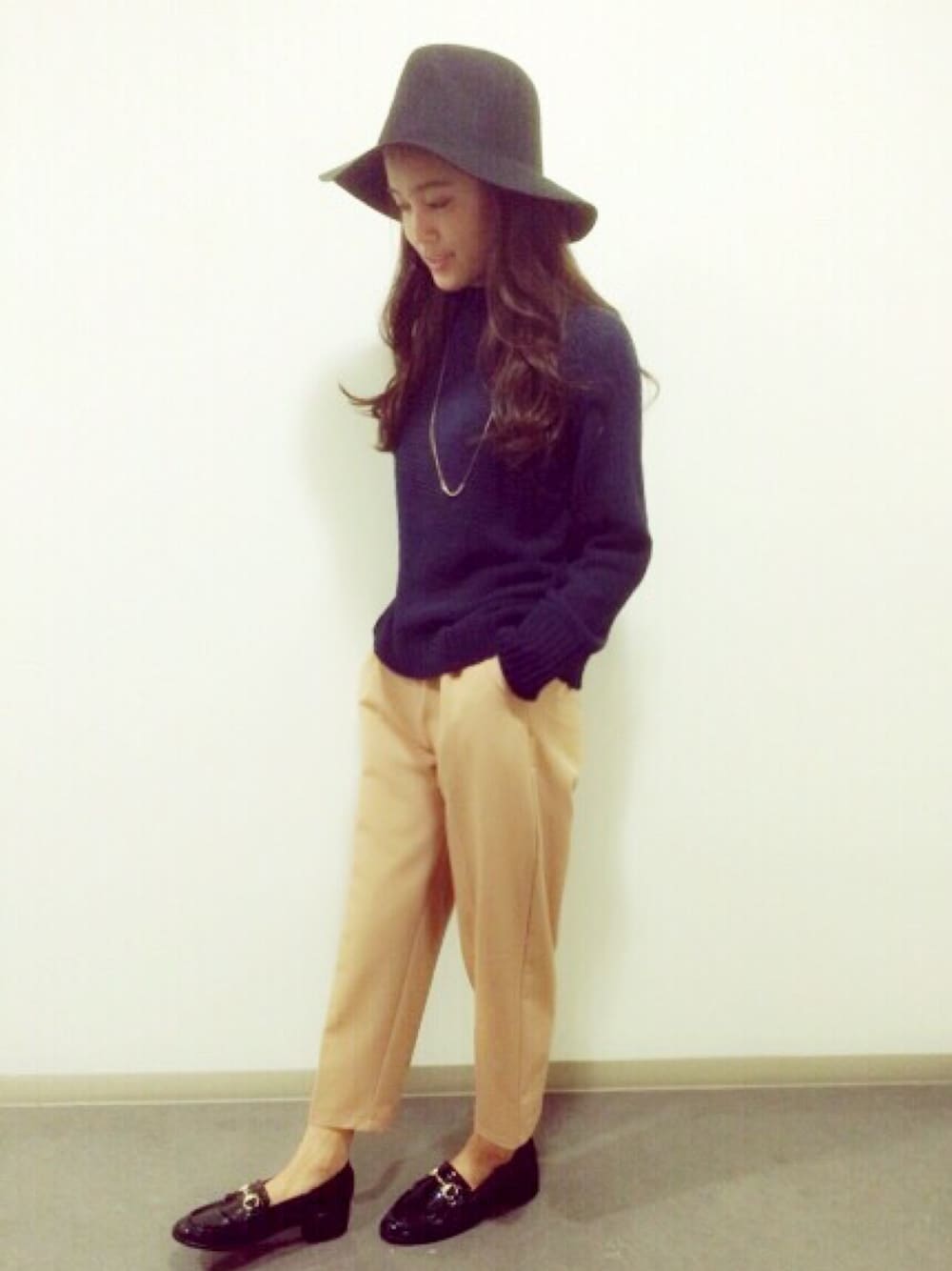 ネイビーのニットに キャメルのパンツで シンプルに大人コーデ