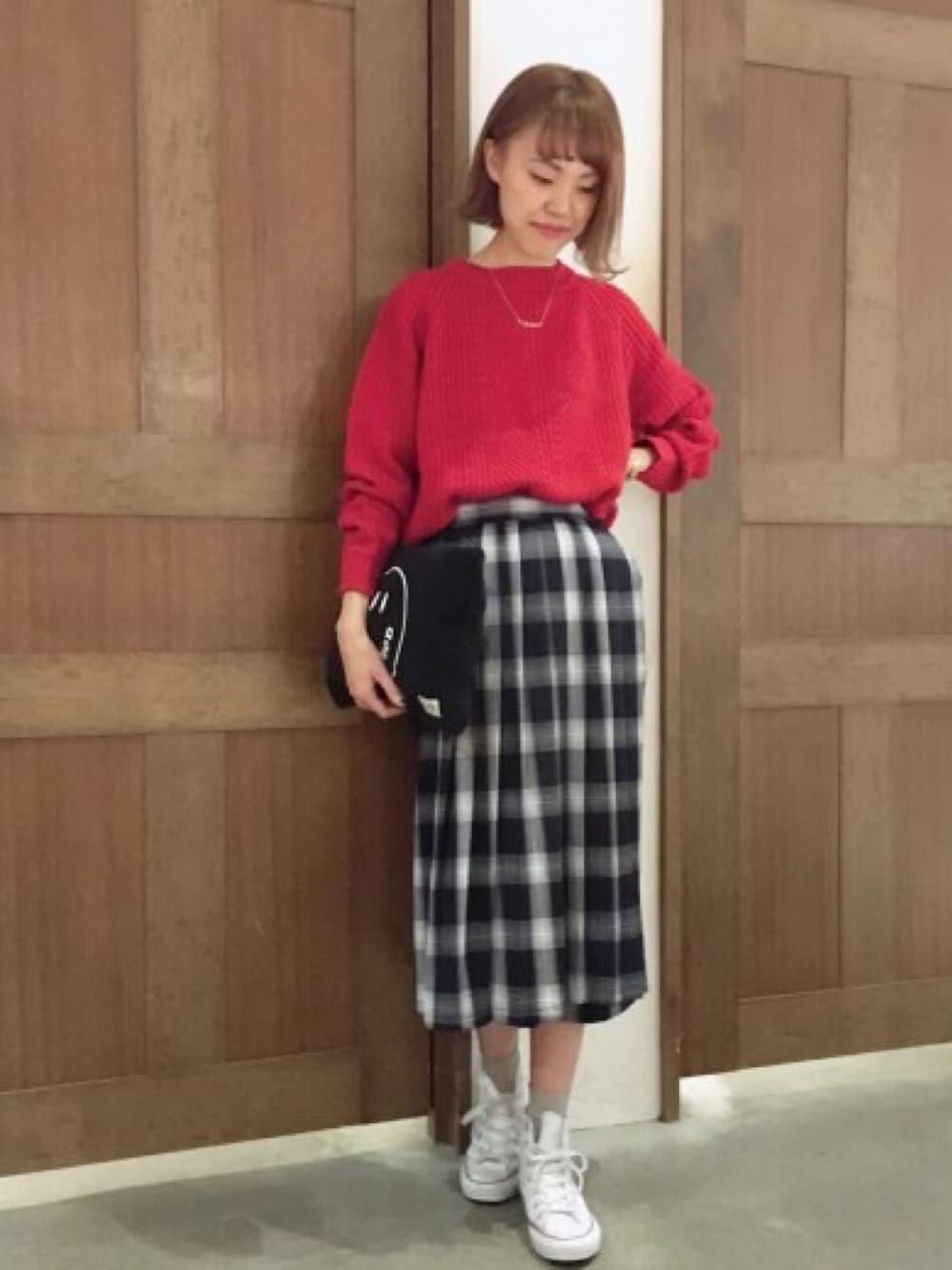 ハロウィン盛り上がってますね✳︎ 自分が上がっている今更にオススメの 真っ赤なニット♡ チェック柄のスカートと合わせればシックなコーデになります^ ^