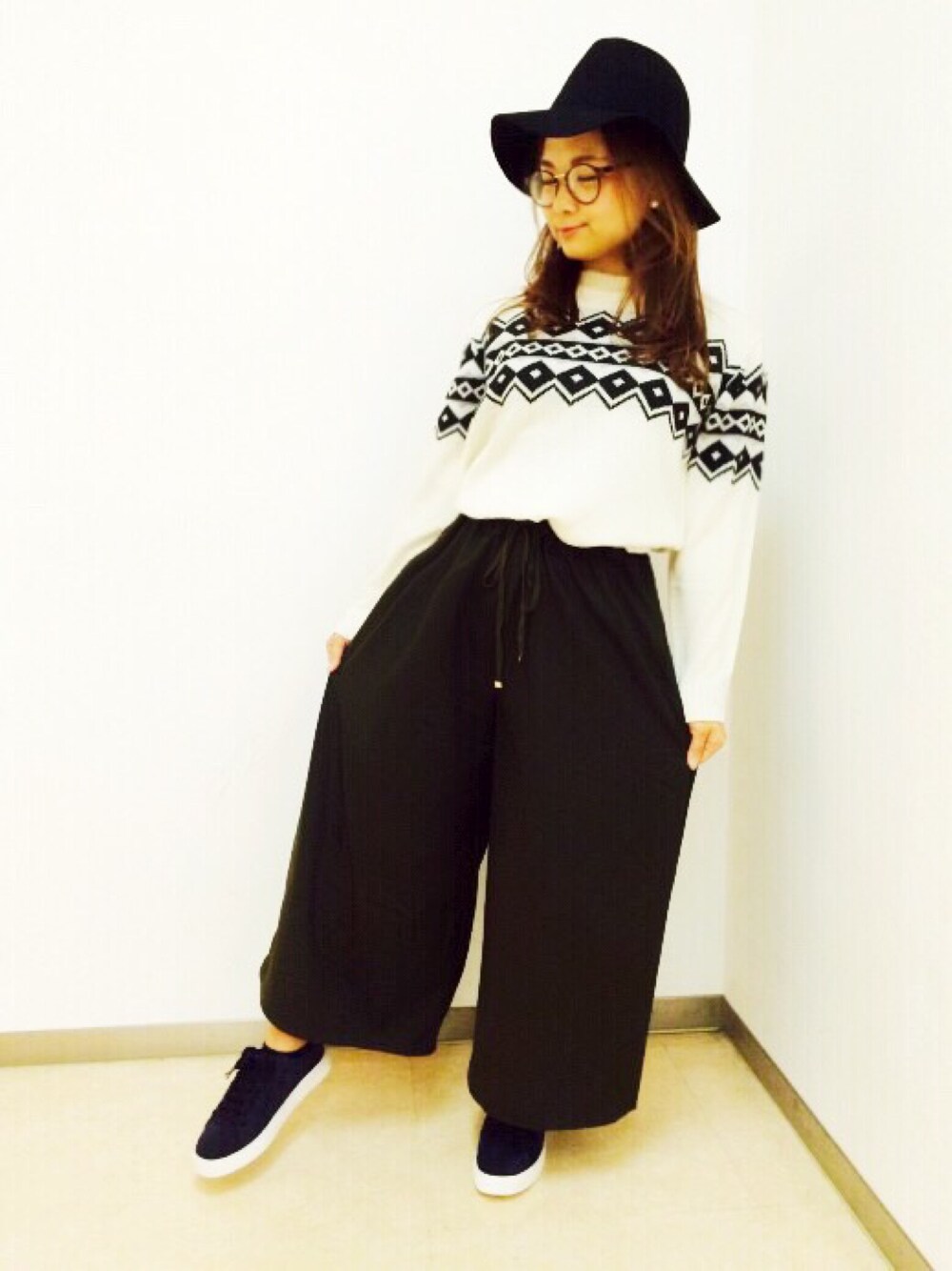 幾何学柄のニットを主役に モノトーンでまとめて ハットと丸メガネで オジ可愛く。。。