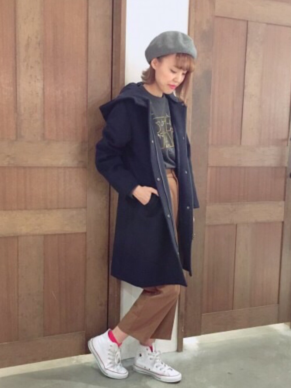 archives今季イチオシの フードコートは フードをとるとキレイめにも キャメルのパンツに junk foodのTシャツで カジュアルダウン