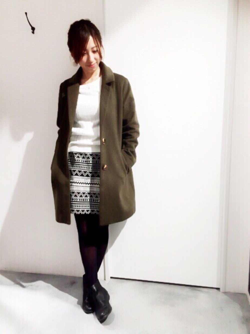 大人気のチェスターに 幾何学柄のタイトスカートを合わせた シンプルモード チェスターコートは 今年の新色 カーキがオススメ!!