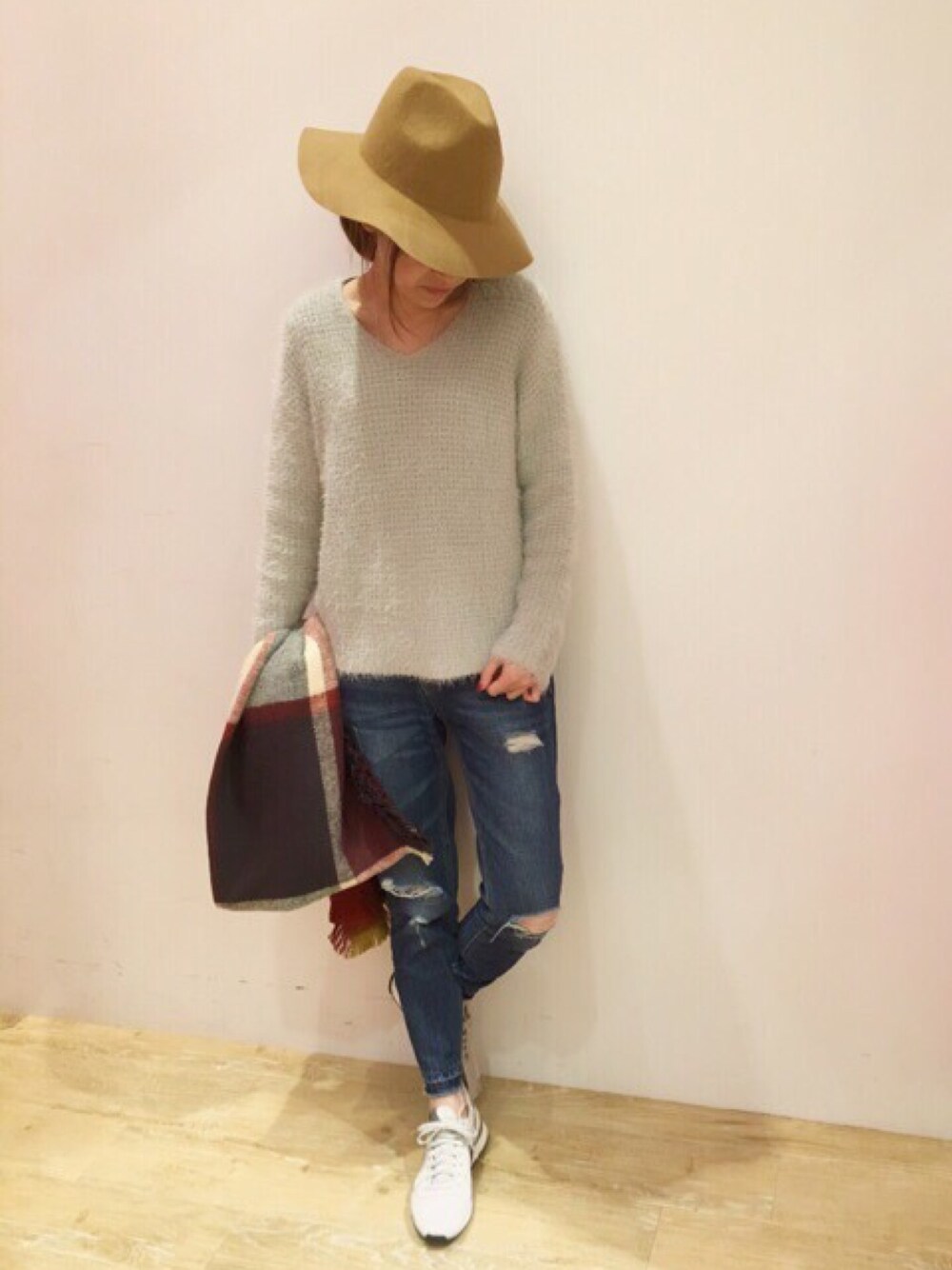 肌触り抜群のシャギーニットと ダメージデニムを合わせた シンプルなカジュアルコーデ Vネックニットで 女性らしさも演出してくれます