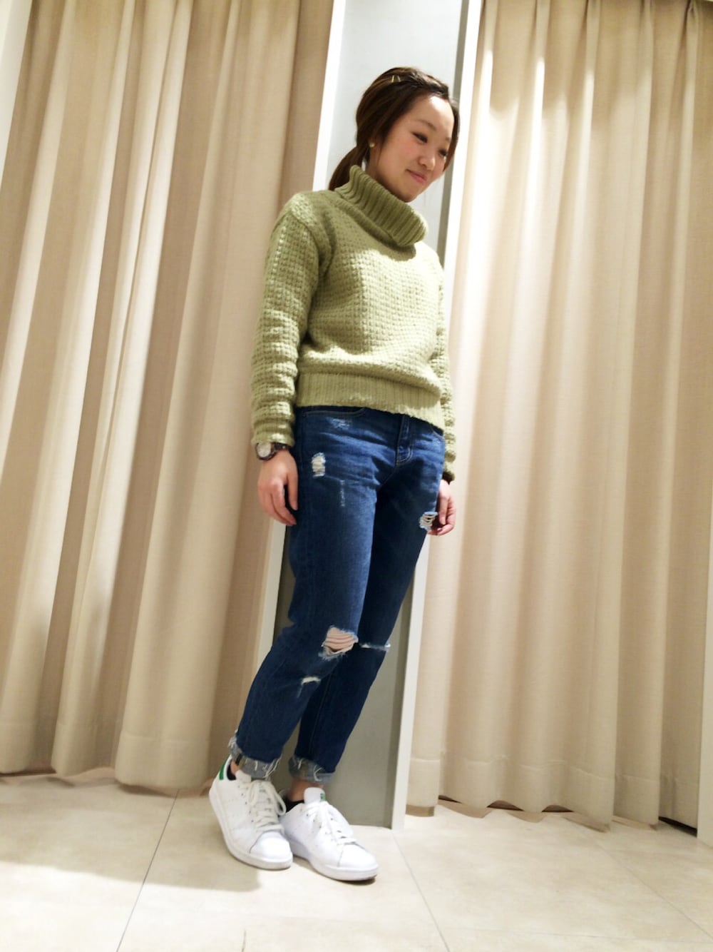 この冬ダスティーパステルが大人気! キレイなグリーンのタートルニットは ショート丈なので ボトムを選ばない ダメージデニムで カジュアルダウン♫ ***福袋ご予約受付中*** ご予約特典として、9種類の中から お好きなアウターをお選び頂けます 詳しくは店舗にて