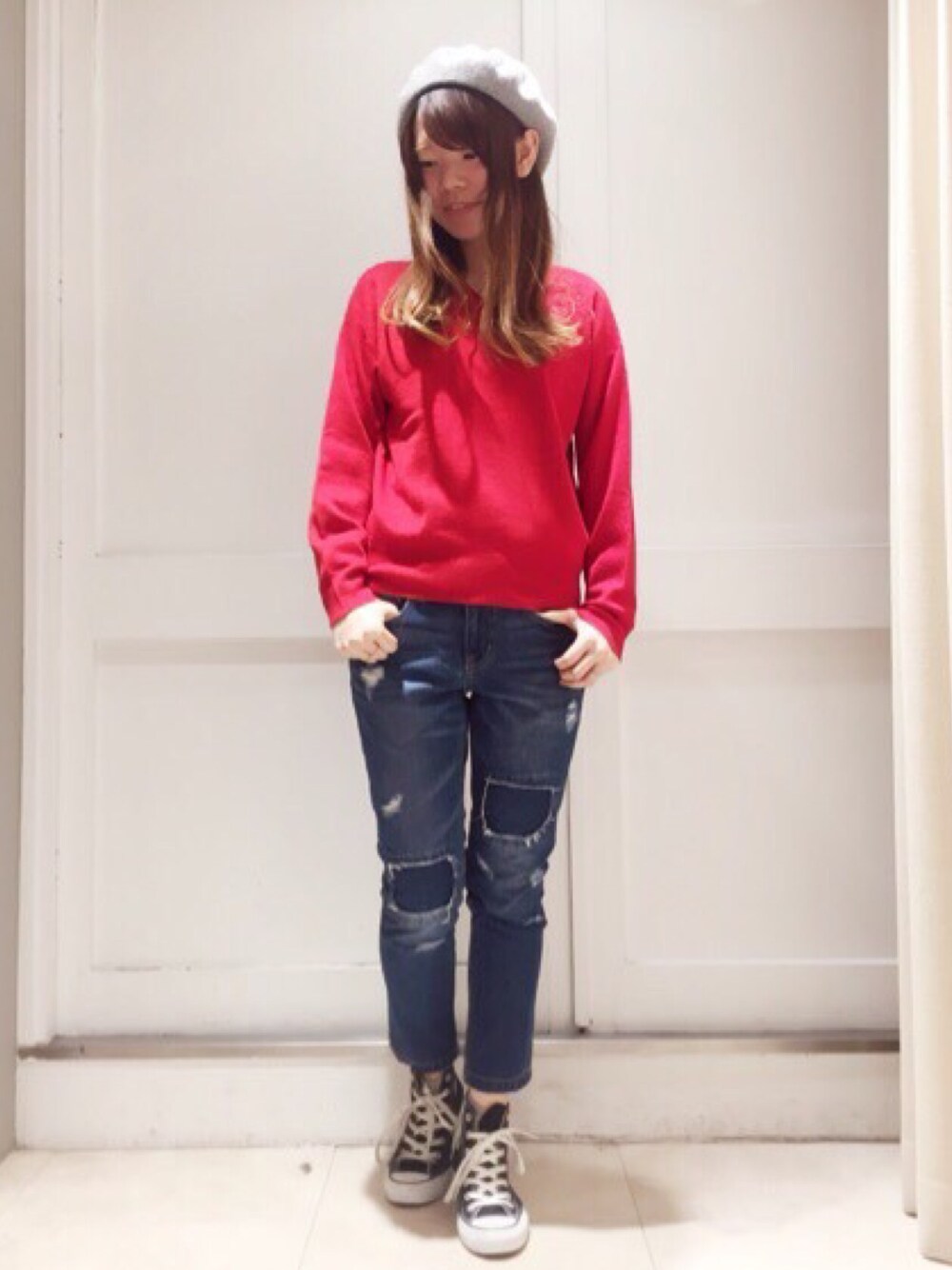 色味が重たくなりがちな冬に もっておきたい 真っ赤なニット! ダメージデニムで カジュアルダウンがオススメ♪