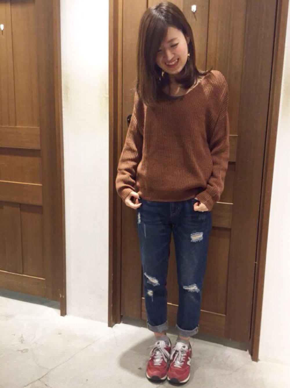 Vネックのゆるニットに ダメージデニムの カジュアルリラックスコーデ