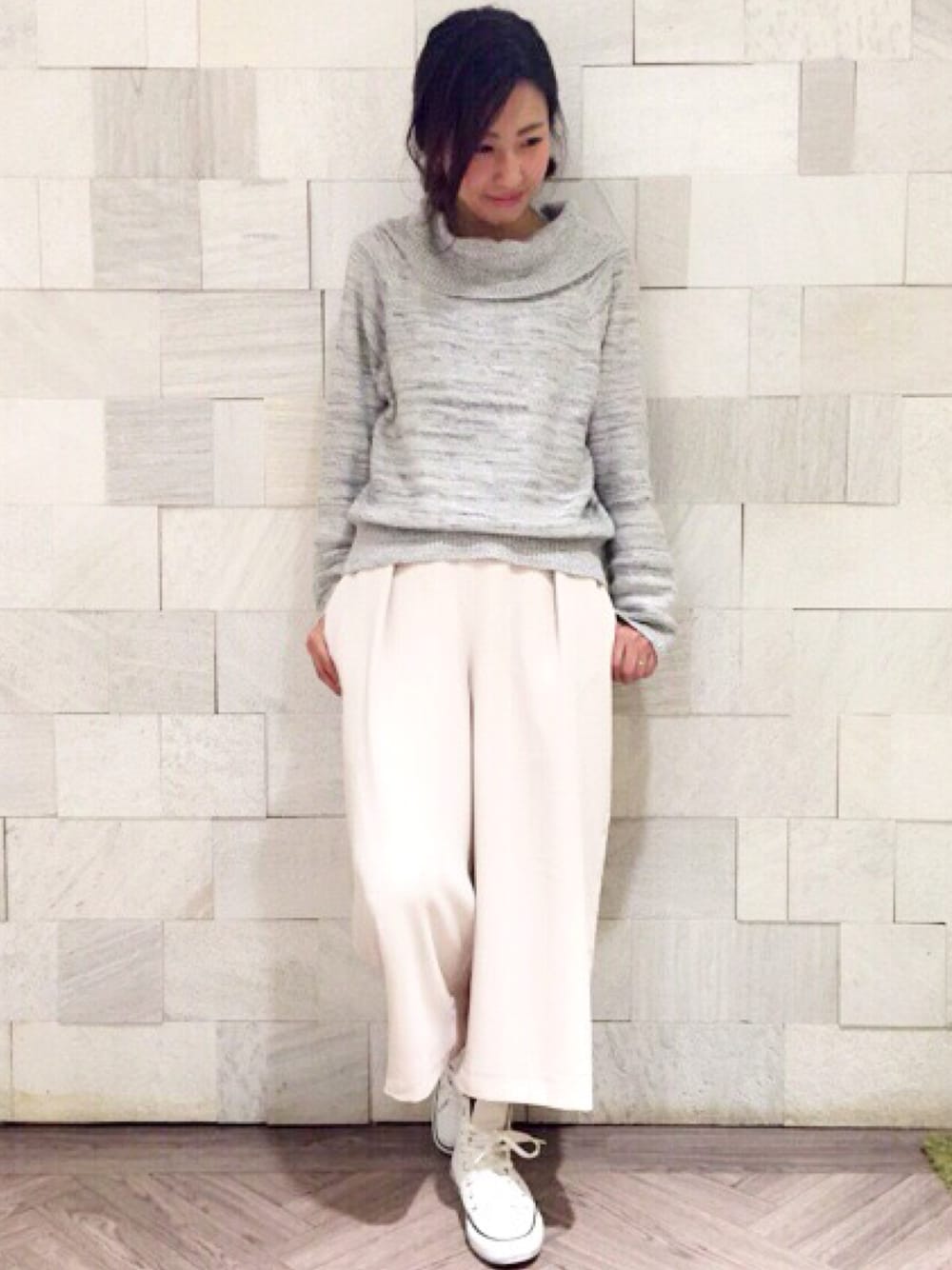 フェミニンなシルエットの オフショルダーニットに タックガウチョパンツで ワントーンコーデ