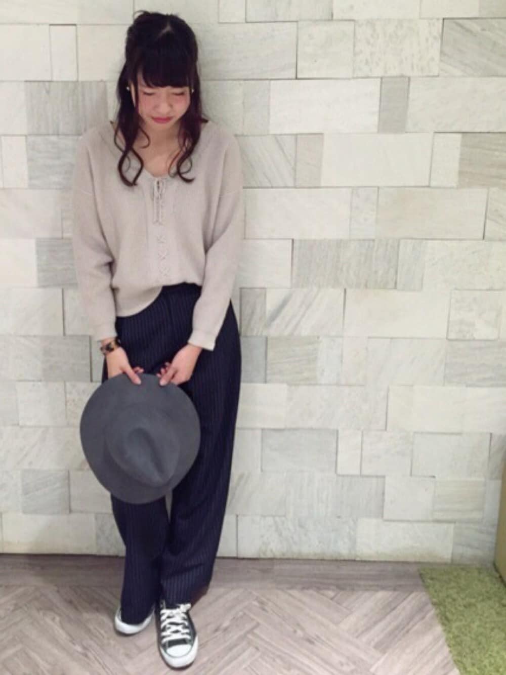 レースアップのニットは 前後ろどちらでも使用可能! ワイドパンツと合わせて フェミニンな ゆるコーデ♫