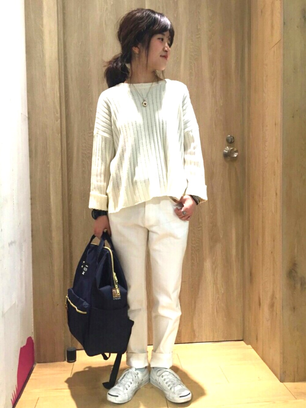 リブニットに ホワイトデニムで 冬のオールホワイト リュックとスニーカーで カジュアルに。。。
