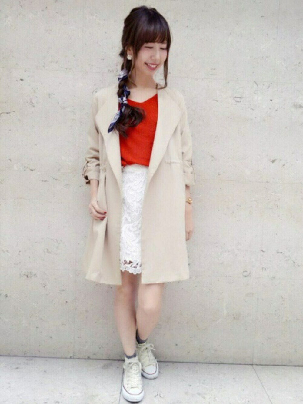 赤ニットをポイントにしました✳︎ レーススカートを合わせるだけで大人っぽく着こなせます(^^) アウター:2月末入荷予定