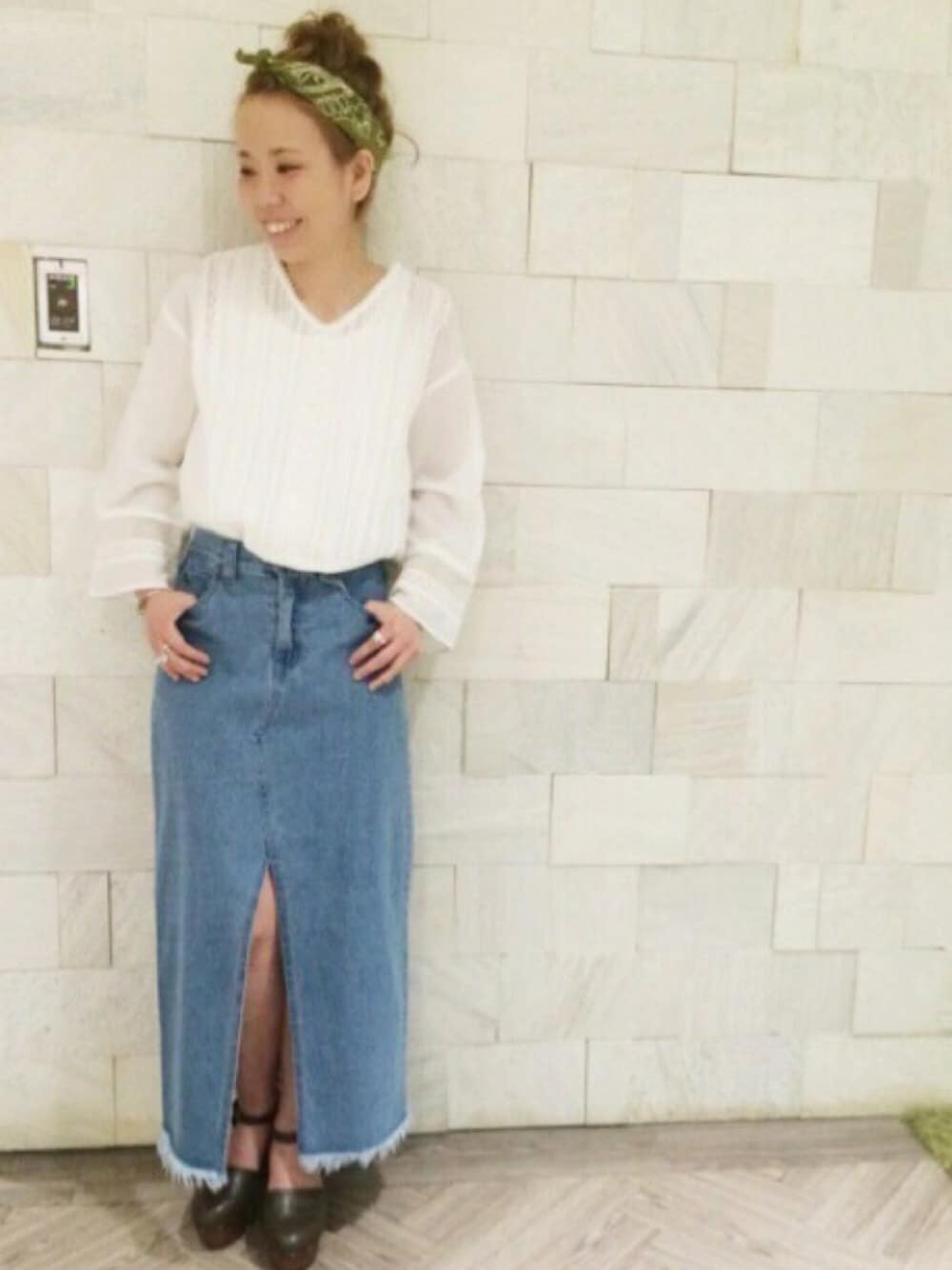 ピンタックレースのブラウスに カットオフデニムスカートで ヴィンテージ感あふれる ヒッピーガール