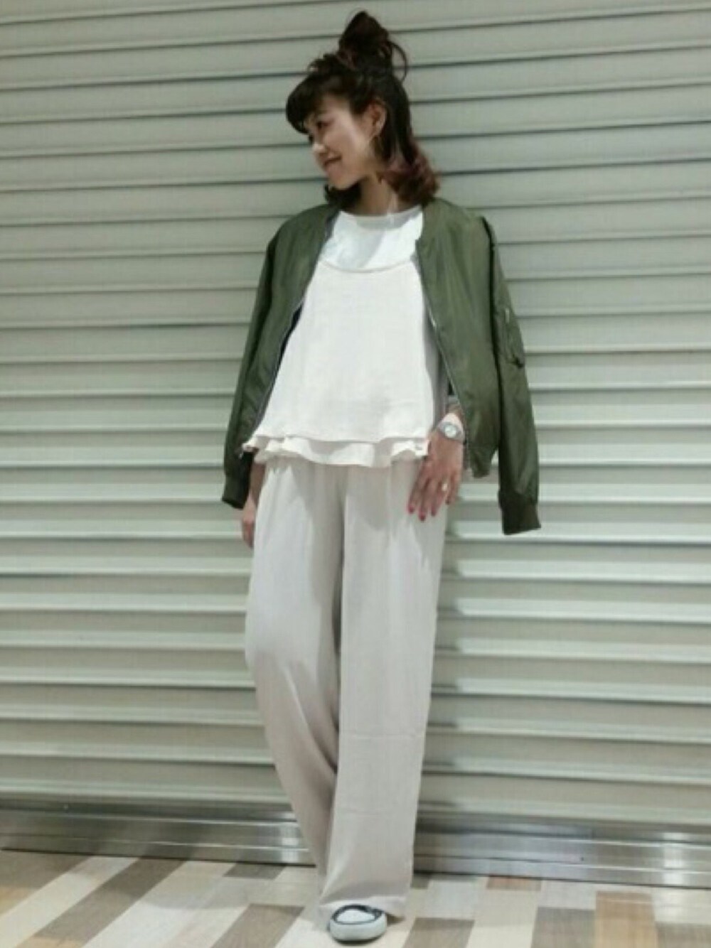 同色のキャミブラウスと ワイドパンツで オールインワン風 MA-1にスニーカーで スポーティーに