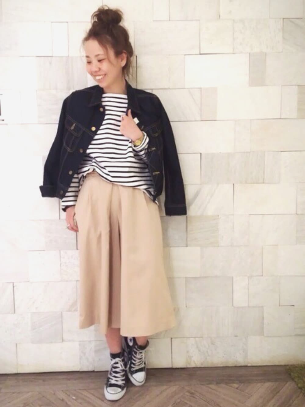 デニム×ボーダーの 定番コーデ!! スカーチョで 今年らしいく!! ボーダーのトップスは ドロップショルダー なのがかわいい!!