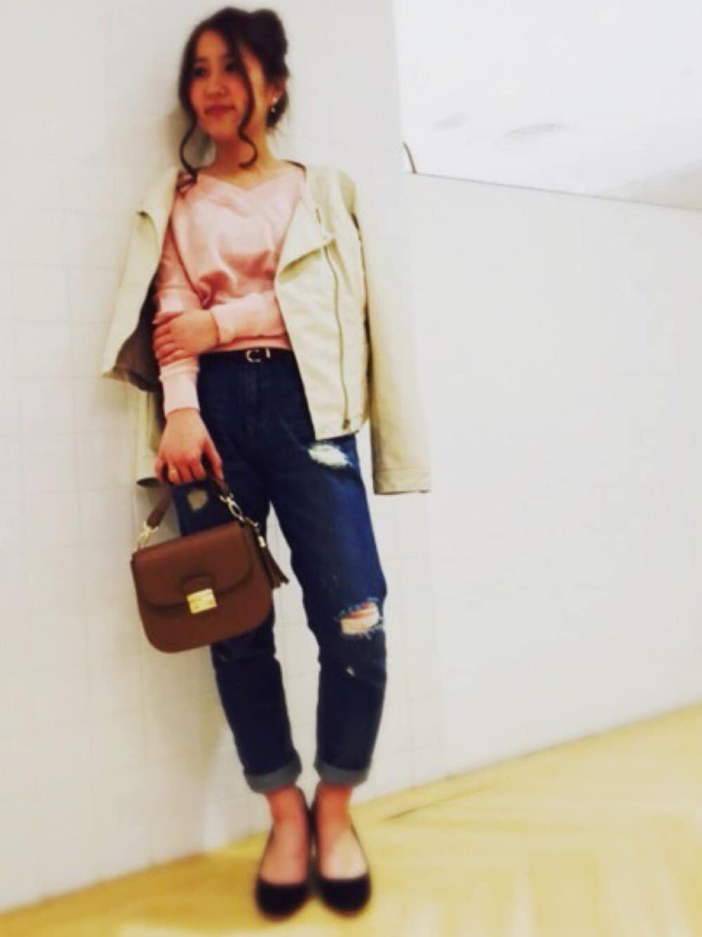 UV加工付のピンクニットに ダメージデニムと ライダースジャケットで レディなカジュアルコーデ