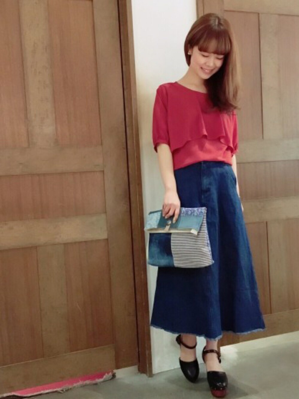 真っ赤な赤が目をひく フリルブラウスに デニムスカートで GWおでかけコーデ! こちらのブラウスは 店舗限定商品です * * * * InstagramとFacebook始めました! プロフィールにURL載せてますので 是非フォローお願い致します * * * *