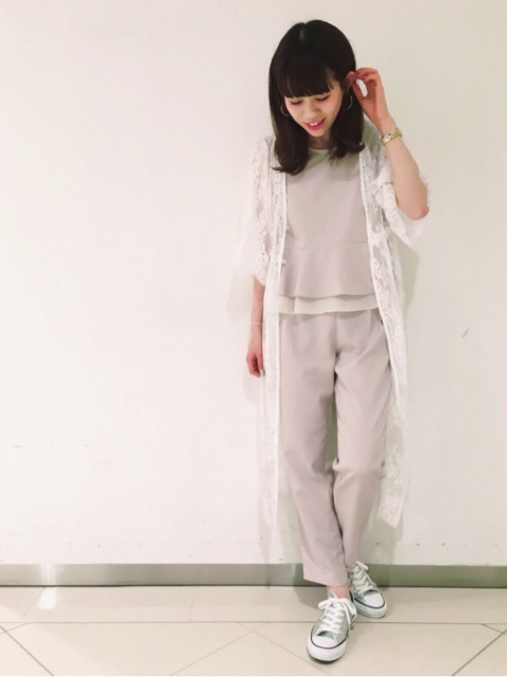再入荷のセットアップに 新作レースガウンの 売れ筋春コーディネート! こちらのレースガウンは テロンチのインに着て レースをチラ見せしても◎