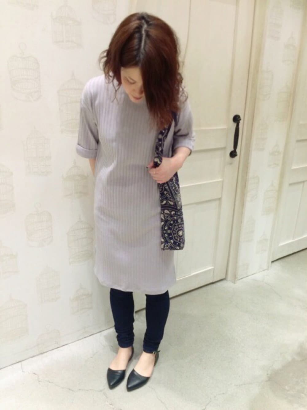 ワイドリブの カットソーワンピースは アイスグレーがオシャレ! バンダナ柄バッグで トレンド感をプラス