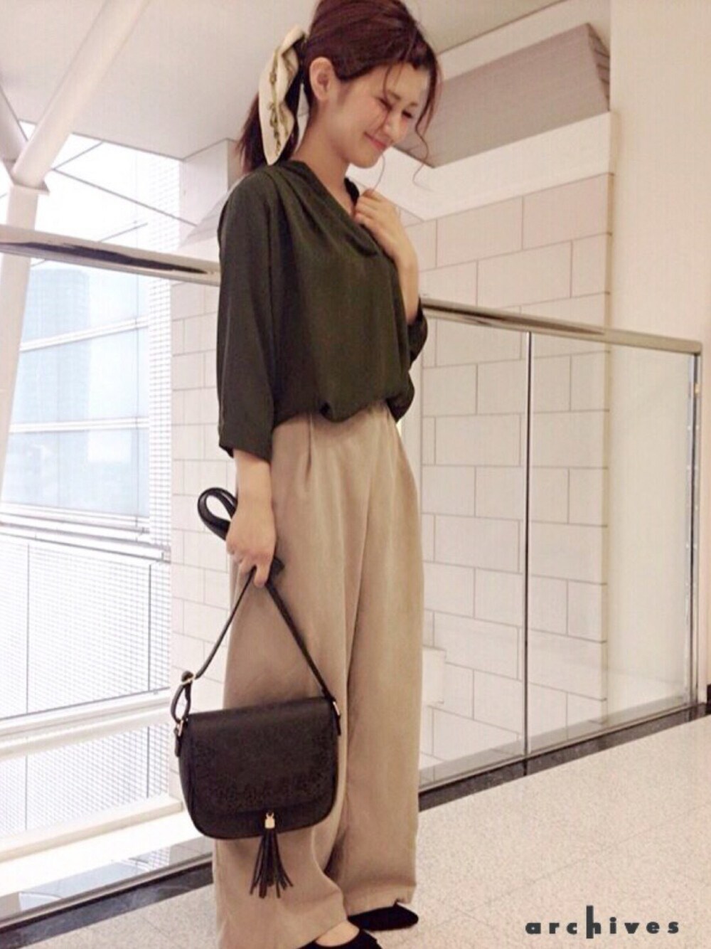 カーキのスキッパーシャツを ワイドパンツにインした キレイめカジュアル シルク100%のスカーフを ヘアアクセとして使い コーデのアクセントに